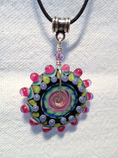 Disc bead pendant in black, pink, turquoise, green, and lavender